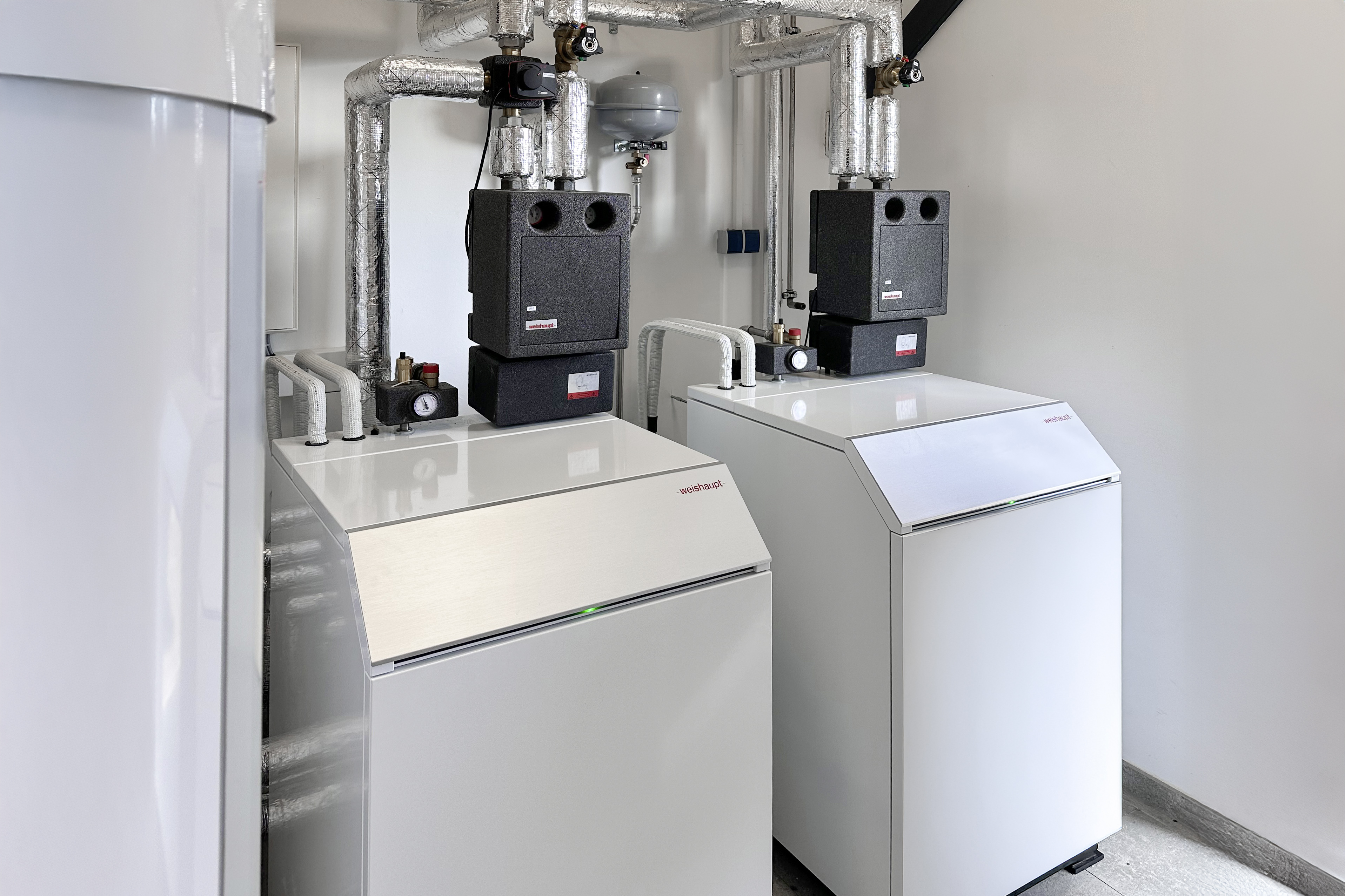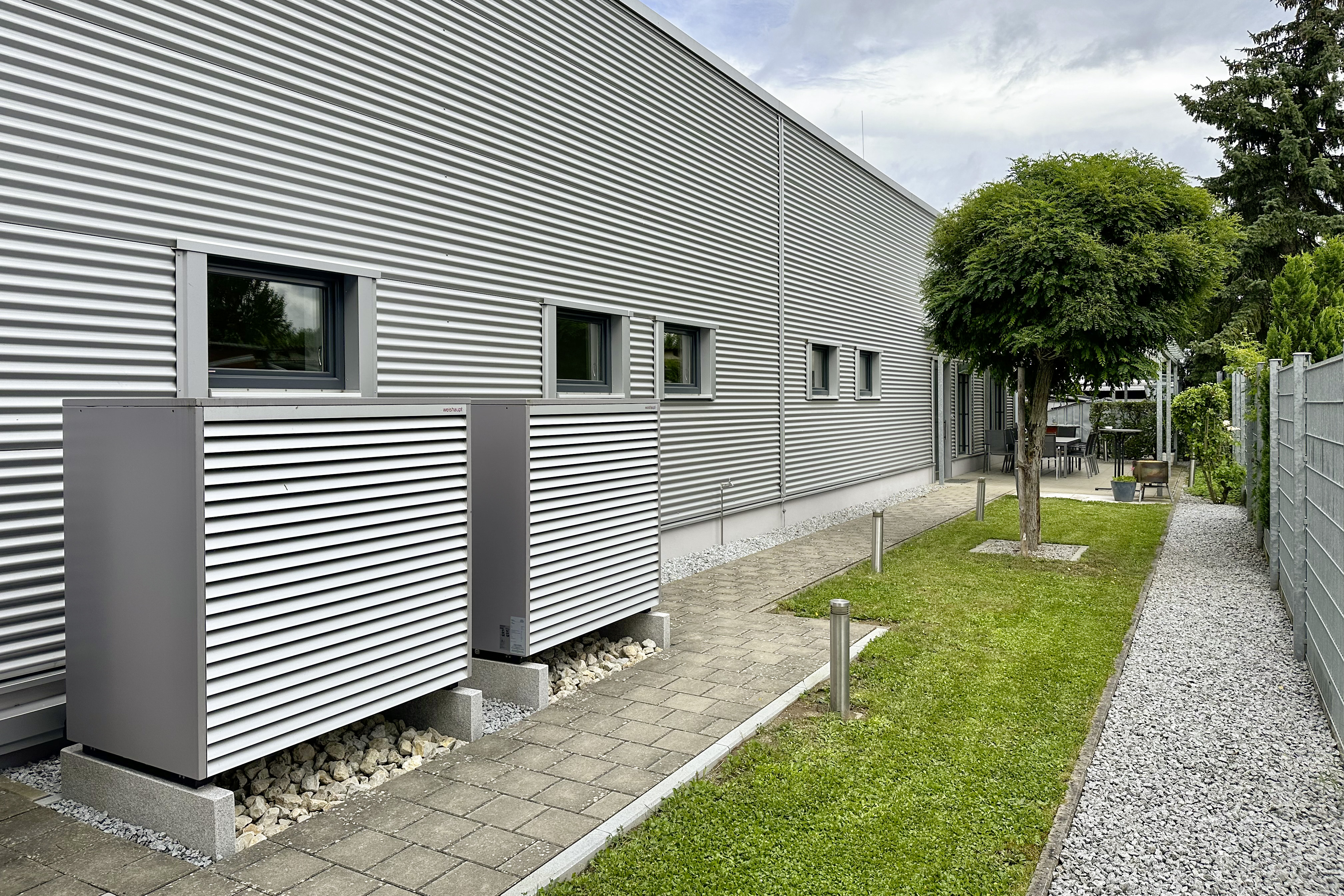 Oorspronkelijk werd het hoofdkantoor verwarmd met een hybride systeem bestaande uit een blokverwarmingscentrale en een gascondensatieketel. Om het doel van een CO 2-neutraal gebouw te bereiken, zijn deze warmtegeneratoren intussen vervangen. Nu verwarmt en koelt een cascade met twee Weishaupt lucht/water-warmtepompen Biblock® WBB 20 het hoofdkantoor. Een PV-systeem met thuisbatterij levert de hernieuwbare stroom. Op het bedrijfsterrijn zijn bovendien laadpalen voor elektrische wagens geïnstalleerd, die ook beschikbaar zijn voor het publiek.