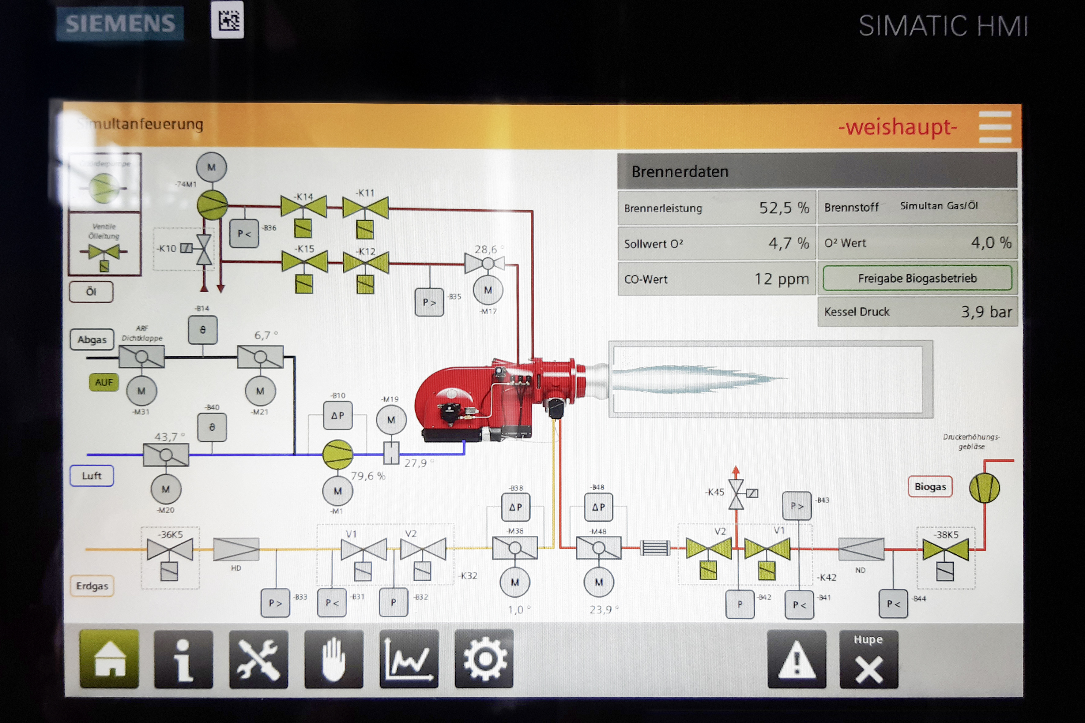 La commande du brûleur fabriquée et testée par Weishaupt et le manager de combustion numérique W-FM1000 CMS ont également été fournis. La visualisation et la commande s'effectuent à l'aide d'un écran tactile.