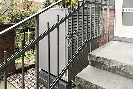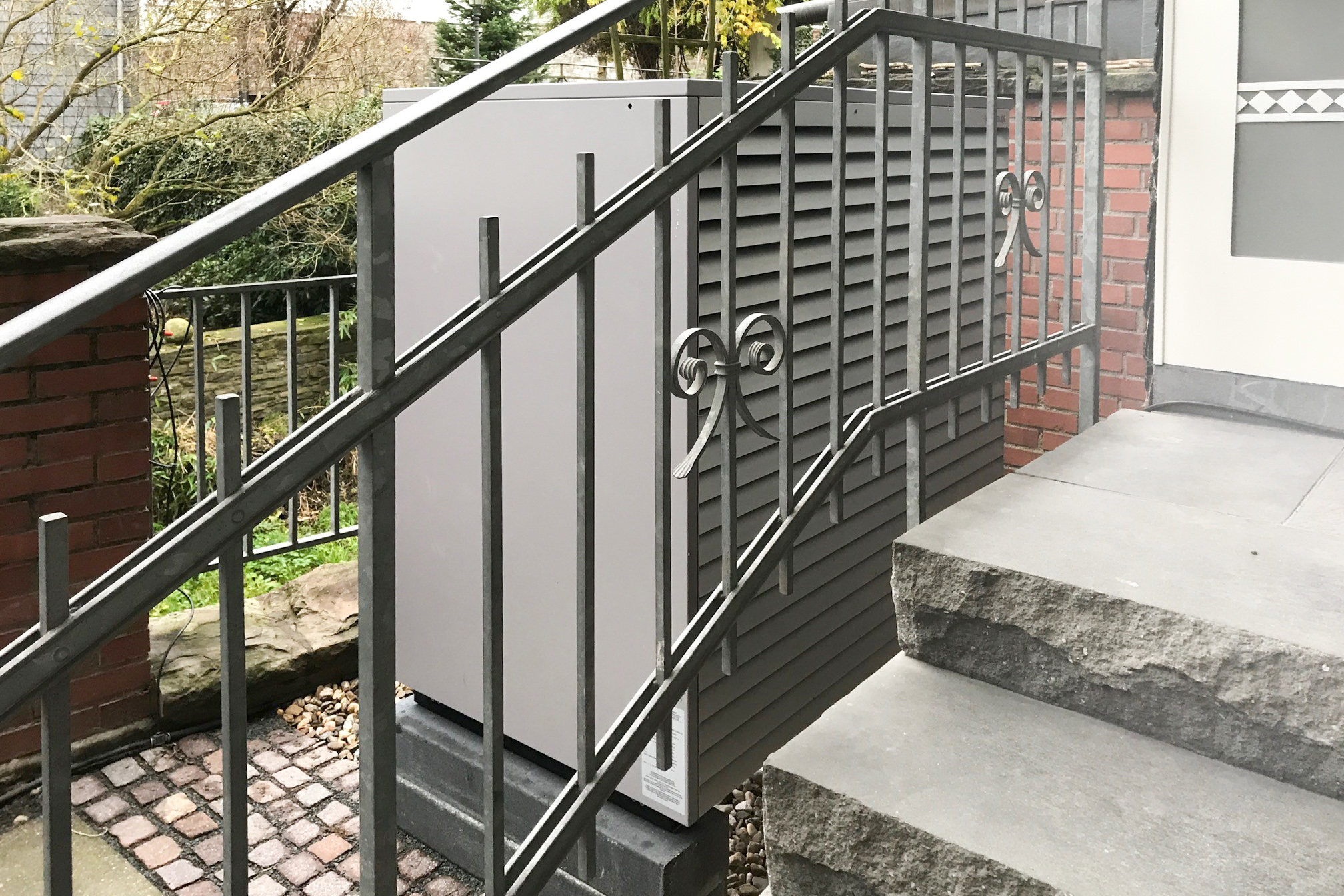 En raison des dégâts causés par de fortes pluies en 2021, le chauffage au mazout surdimensionné avec une puissance de 34 kW a dû être remplacé dans un immeuble résidentiel et commercial comprenant trois appartements et deux magasins. Pour cette maison construite en 1875 d'une surface habitable de 277 mètres carrés, le choix s'est porté sur une pompe à chaleur air/eau modulante Weishaupt Biblock® d'une puissance thermique de 5,6 à 16,6 kW (pour les A2/W35) avec stock tampon. Malgré l'espace très restreint disponible, un emplacement pour l'unité extérieure de la pompe à chaleur qui était satisfaisant en termes de débit d'air et d'émissions sonores a pu être trouvé. Seul un des radiateurs a dû être remplacé. La courbe de chauffe a été réglée sur une température de départ de 55 °C pour une température extérieure normale de -10 °C. Comme auparavant, la production d'eau chaude sanitaire est assurée de manière décentralisée par des chauffe-eau électriques.